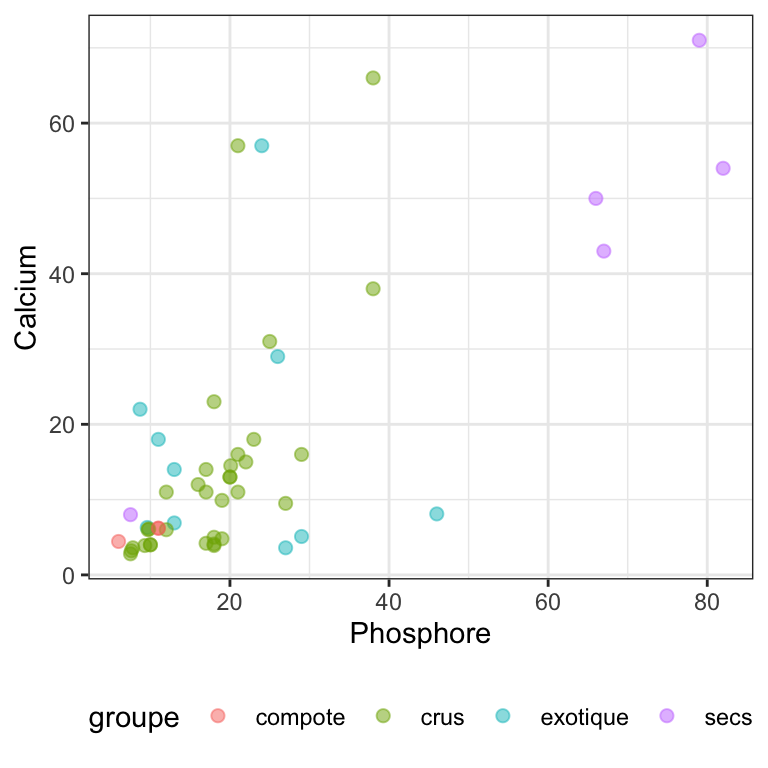 ggplot(fruits, aes(x = Phosphore, y = Calcium, color = groupe)) + geom_point(alpha = 0.5, size = 2) + theme_bw() + theme(legend.position = "bottom")