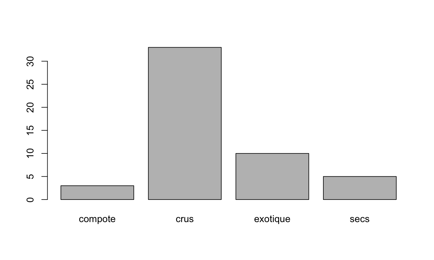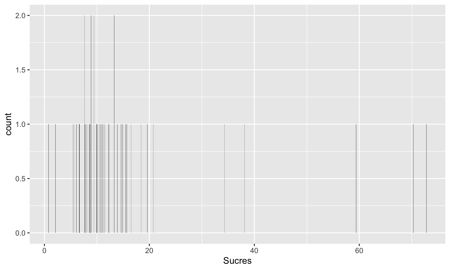 en variable catégorielle (avec 4 catégories),ggplot(fruits, aes(Sucres)) + geom_bar()