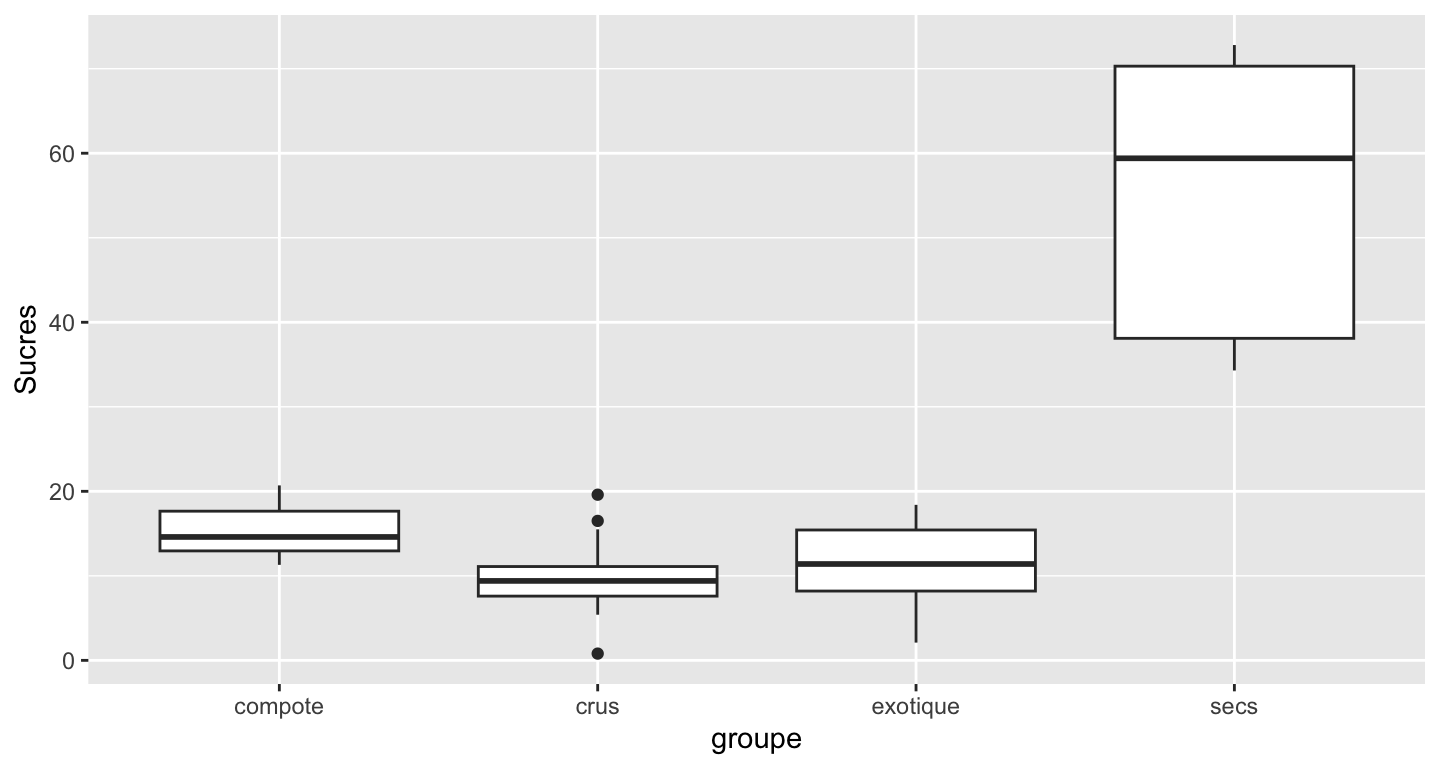 ggplot(data=fruits, aes(x=groupe, y=Sucres)) + geom_boxplot()