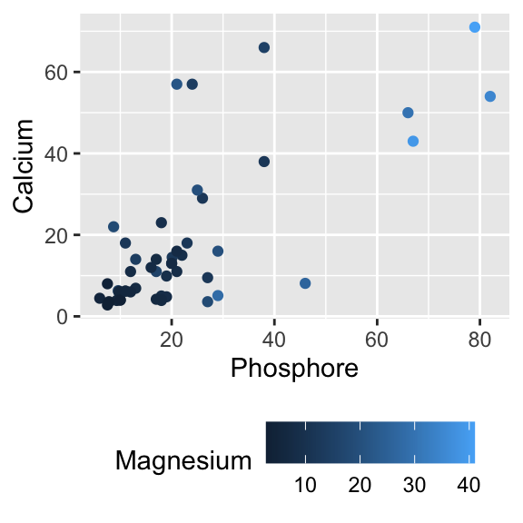 ggplot(fruits, aes(x = Phosphore, y = Calcium, color = Magnesium)) + geom_point() + theme(legend.position = "bottom")