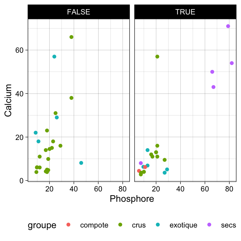 ggplot(fruits, aes(x = Phosphore, y = Calcium, color = groupe)) + geom_point() + facet_wrap(vars(Sucres > 10)) + theme_bw() + theme(legend.position = "bottom")