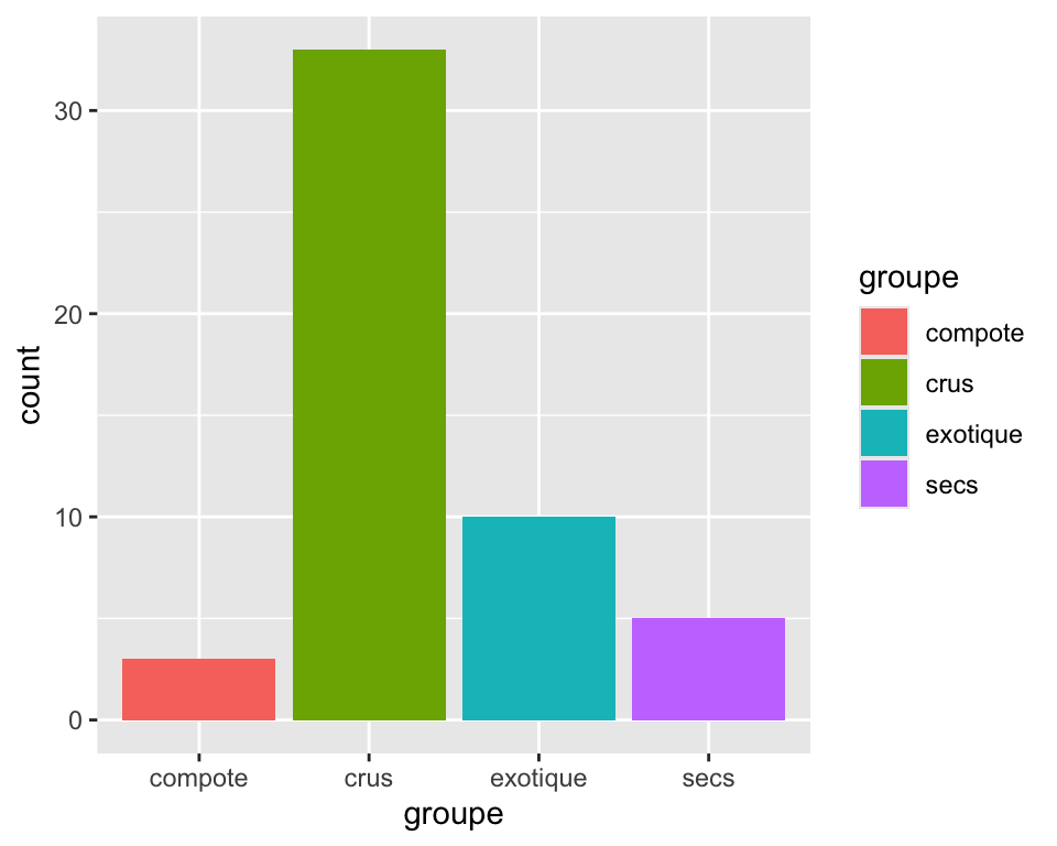 ggplot(data = fruits, aes(x = groupe, fill = groupe)) + geom_bar()