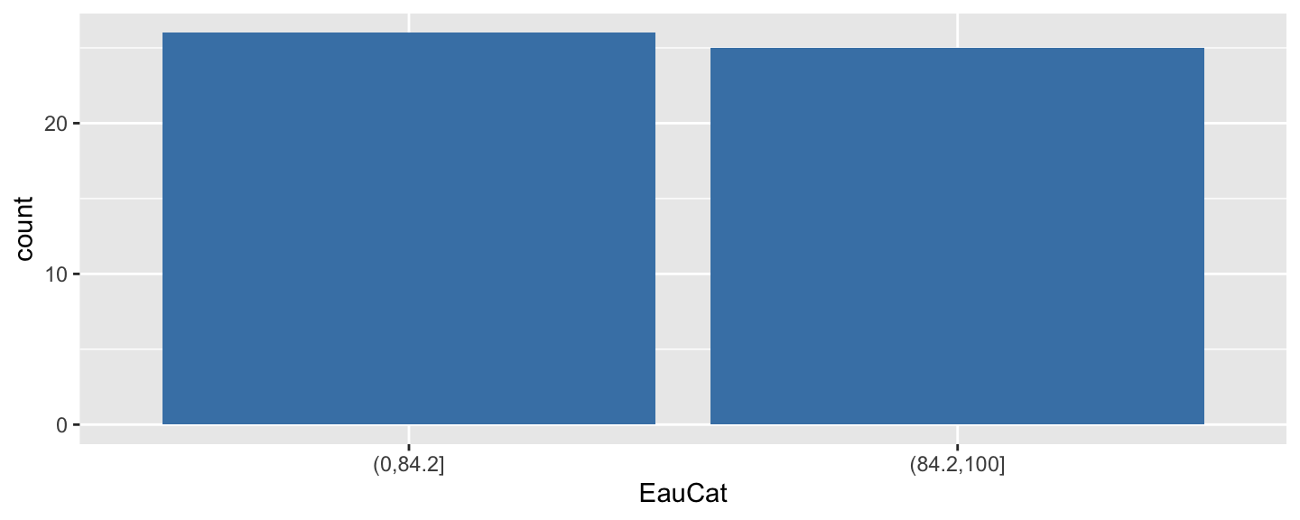 fruits %>% mutate(EauCat = cut(Eau, c(0, 84.2, 100))) %>% ggplot(aes(EauCat)) + geom_bar(fill = "steelblue")