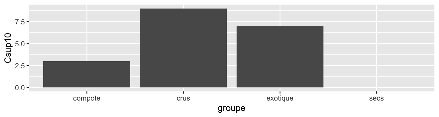dat.count <- fruits %>% group_by(groupe) %>% summarize(Csup10 = sum(VitamineC >= 10)) ggplot(data = dat.count, aes(x = groupe, y = Csup10)) + geom_col()