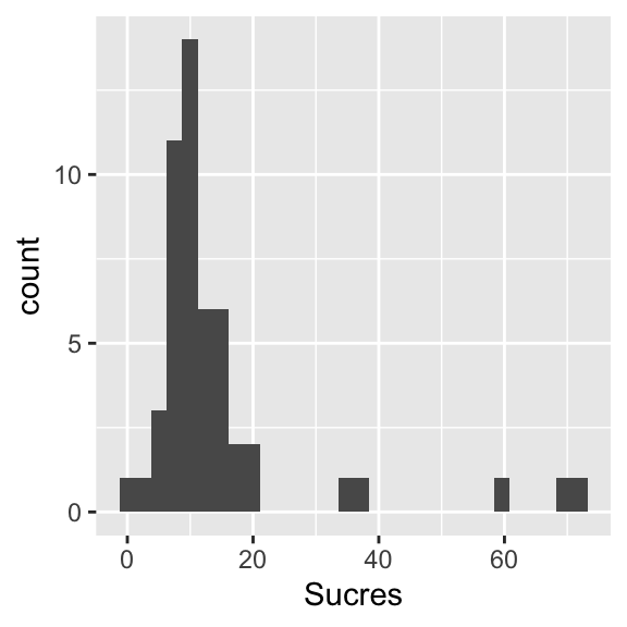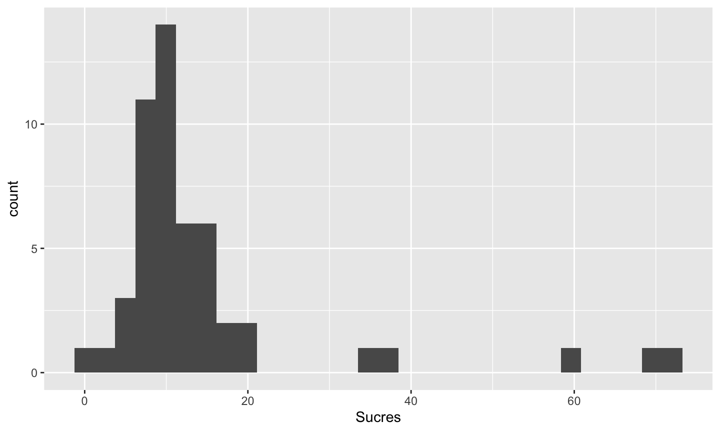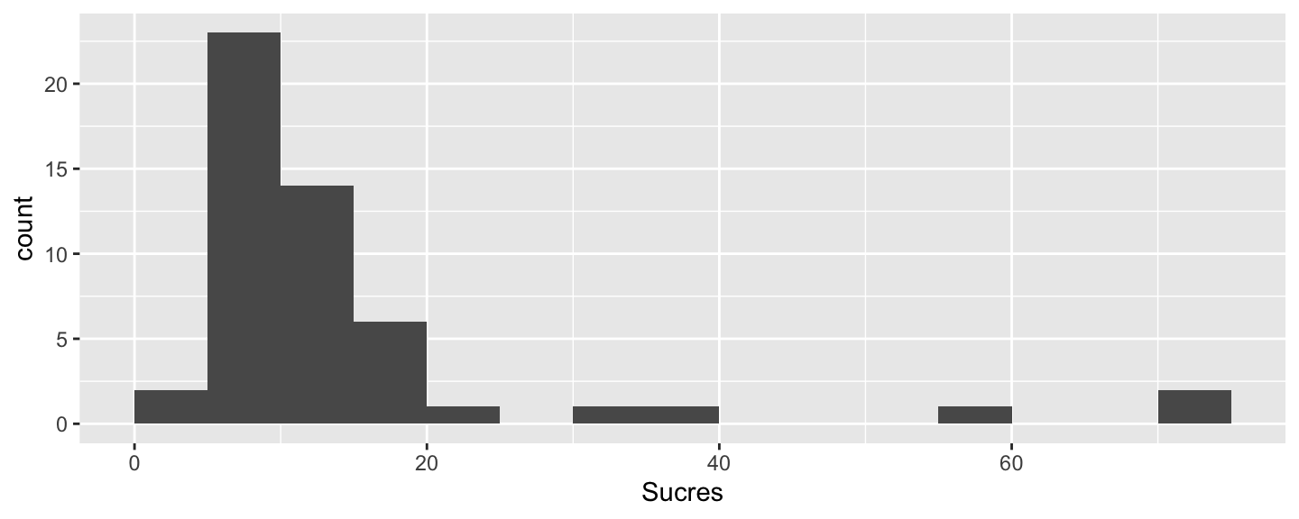 crée par défaut 30 classes, charge à l’utilisateur de changer cela.ggplot(fruits, aes(Sucres)) + geom_histogram(breaks = seq(0, 75, 5))