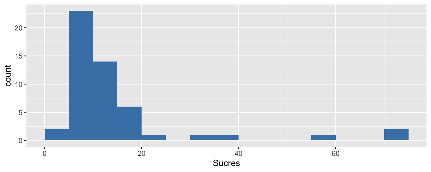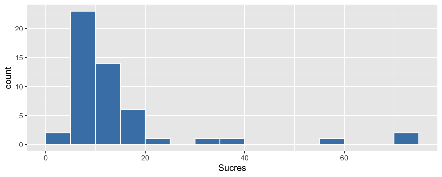 ggplot(fruits, aes(Sucres)) + geom_histogram(breaks = seq(0, 75, 5), fill = "steelblue", color = "white")