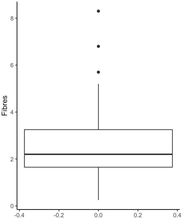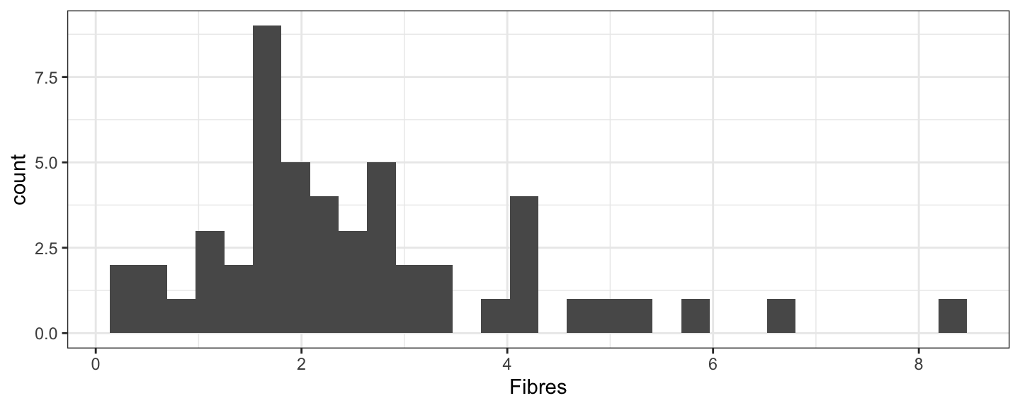 ggplot(fruits, aes(Fibres)) + geom_histogram() + theme_bw()
