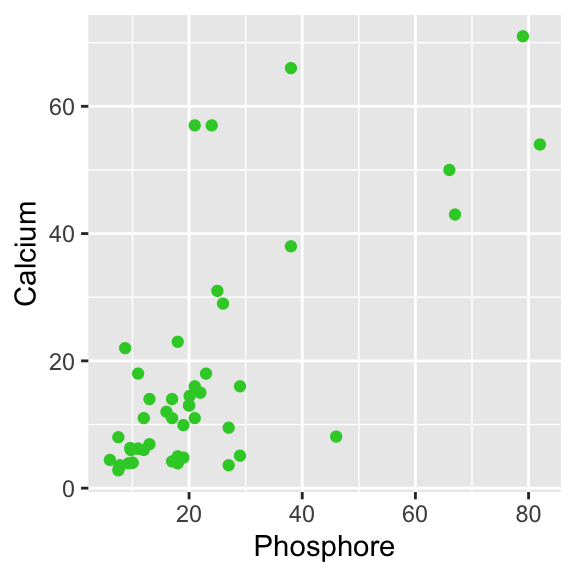 ggplot(fruits, aes(x = Phosphore, y = Calcium)) + geom_point(color = "limegreen")