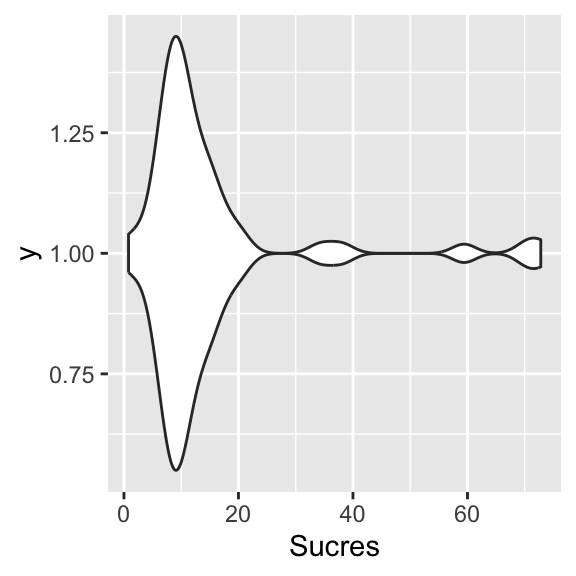 ggplot(data = fruits, aes(x = Sucres, y = 1)) + geom_violin()