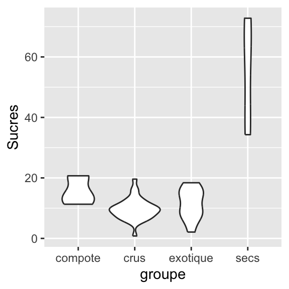 ggplot(data = fruits, aes(x = groupe, y = Sucres)) + geom_violin()