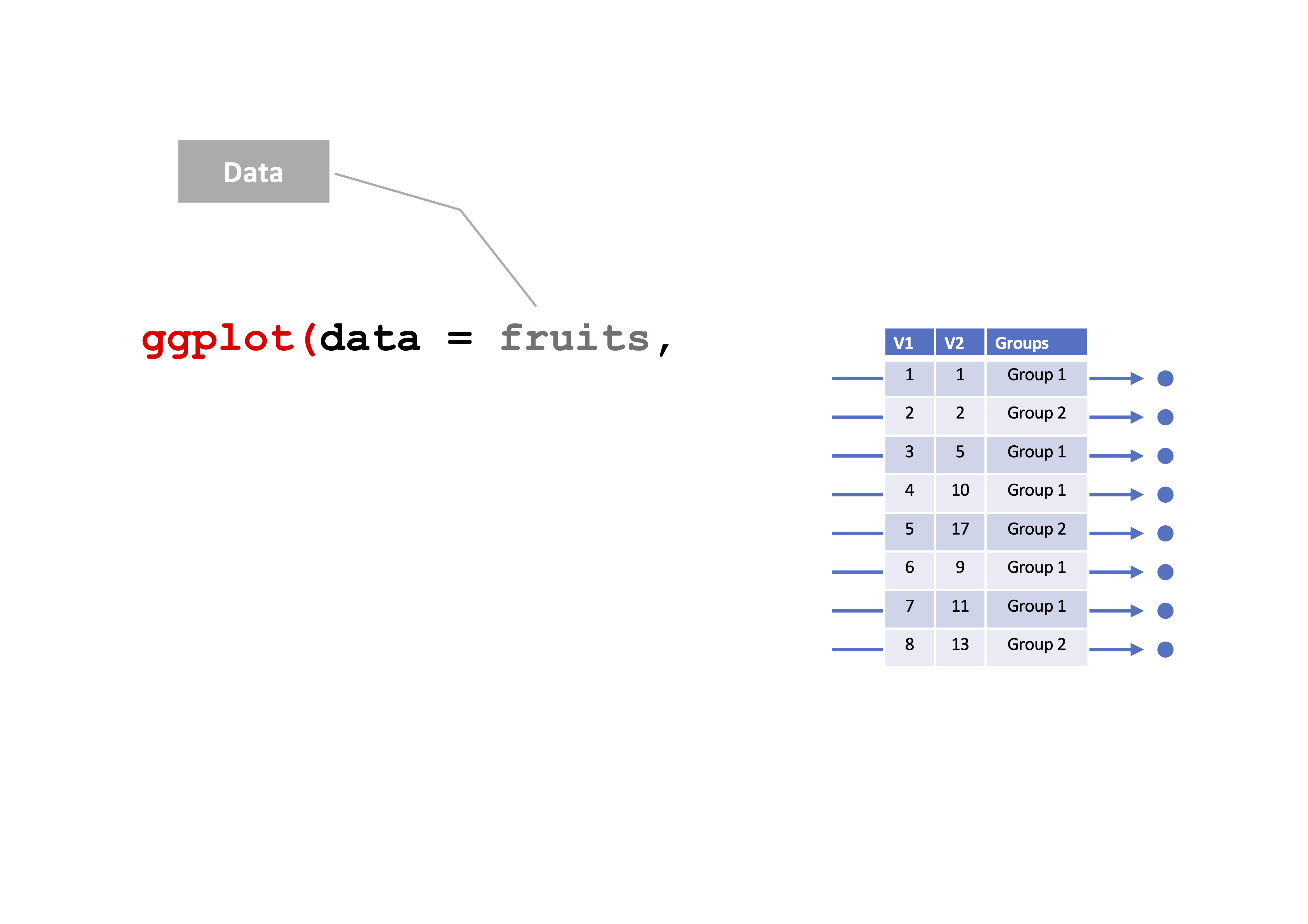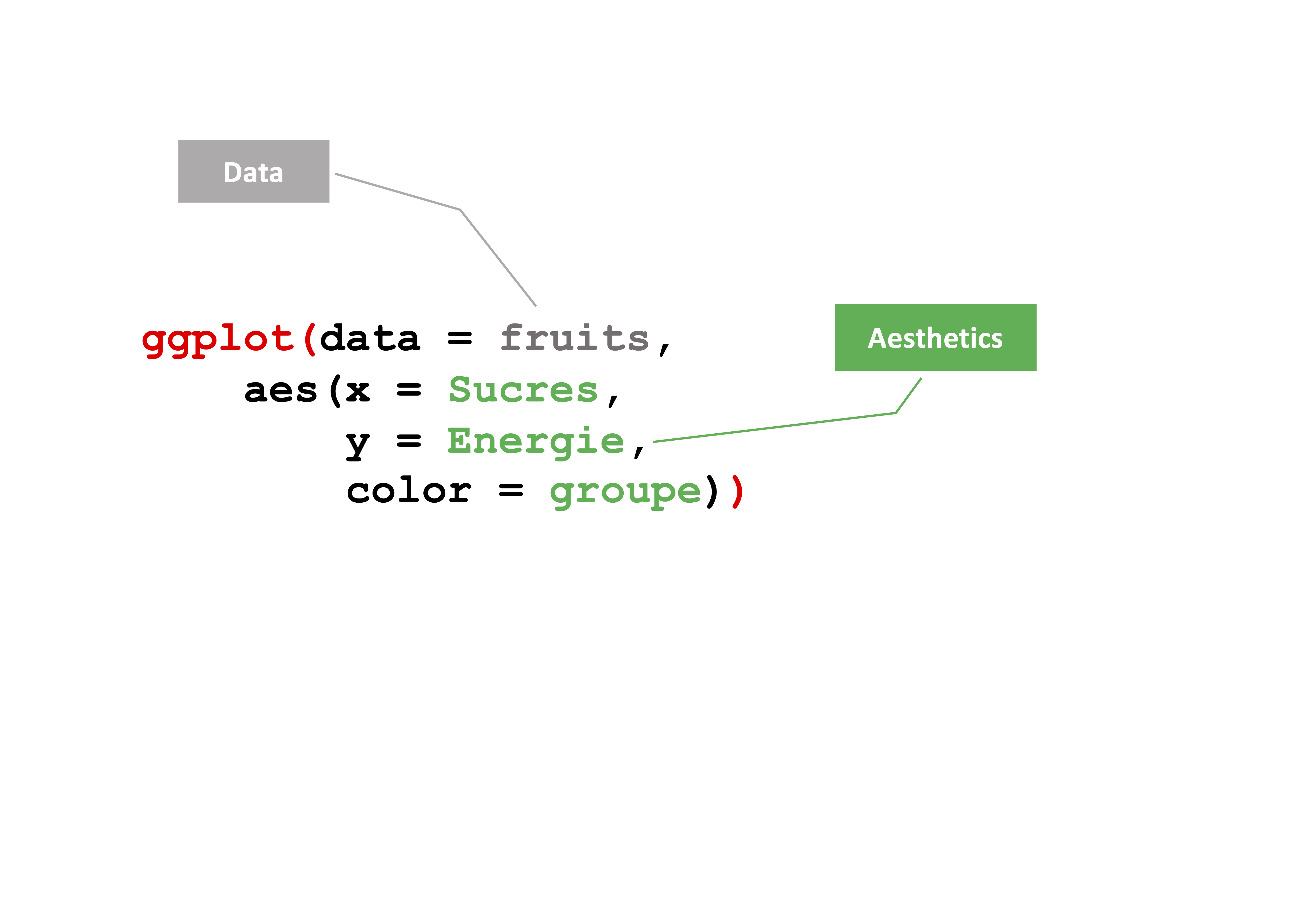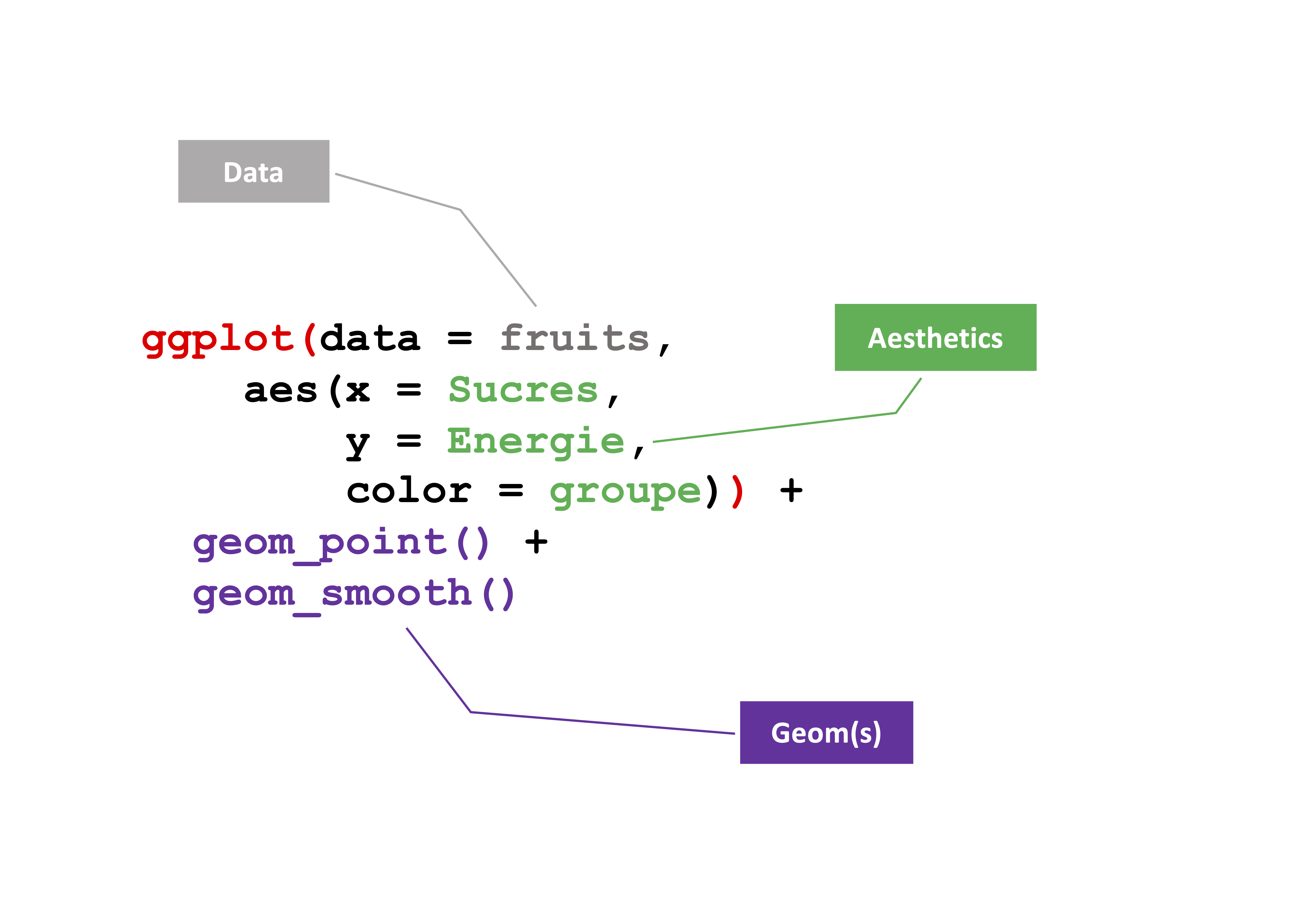 fonctionne sur la base d’un canevas, de paramètres esthétiques comme la position en \(x\), en \(y\), les couleurs, la forme etc. A partir de ces paramètres, on va tracer les graphes à l’aides de géométries, qui peuvent se superposer !