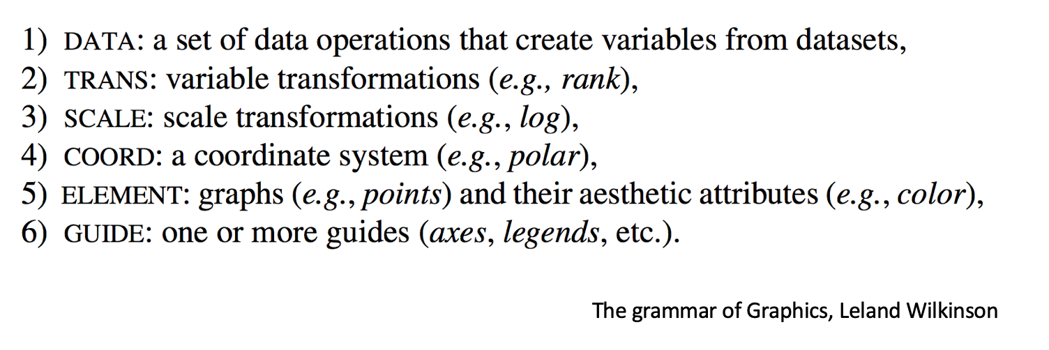 Des fonctions permettant de paramétrer la transformation de données en formes ou en objets graphiques. Par exemple la fonction scale_color_manual permet de choisir soi-même les couleurs à utiliser dans un graphique. |