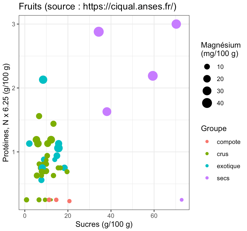 ggplot(fruits, aes(x = Sucres, y = Proteines, *** = Magnesium, *** = ***)) + geom_***() + ***(title = "Fruits (source : https://ciqual.anses.fr/)", x = "Sucres (g/100 g)", y = "Protéines, N x 6.25 (g/100 g)", size = "Magnésium\n(mg/100 g)", ***= "Groupe") + theme_***()
