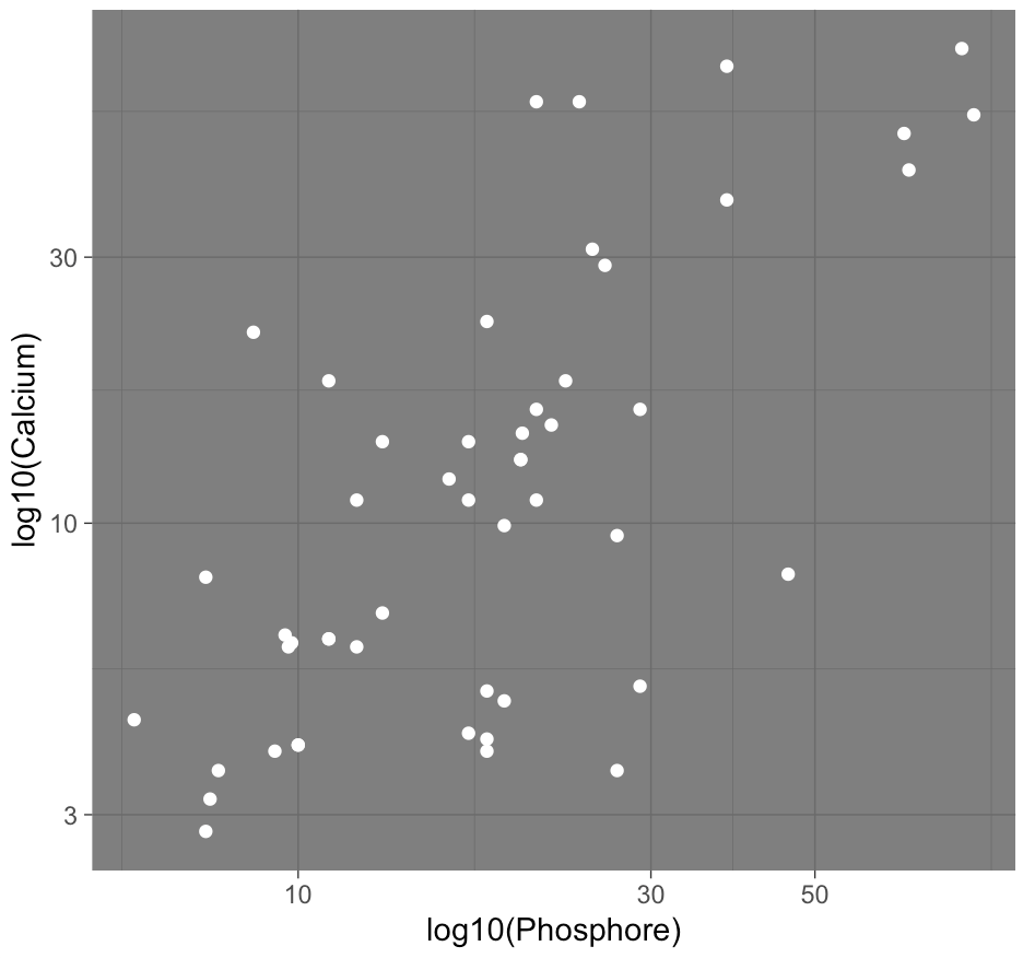 ggplot(fruits, aes(Phosphore, Calcium)) + geom_point(*** = "white") + scale_***() + scale_***() + labs(x = "log10(Phosphore)", y = "log10(Calcium)") + theme_dark()