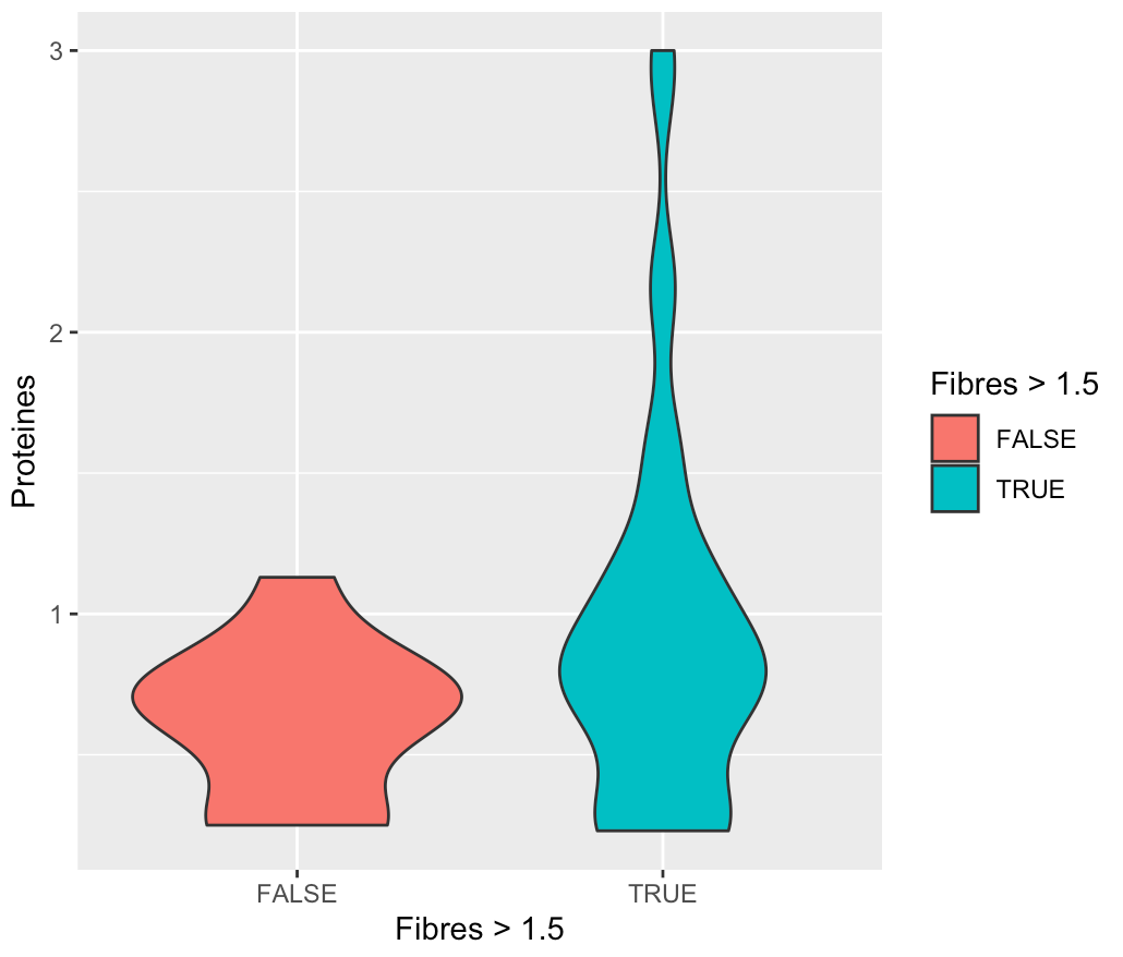 ggplot(fruits, aes(x = Fibres > 1.5, y = Proteines, fill = ***)) + geom_***()