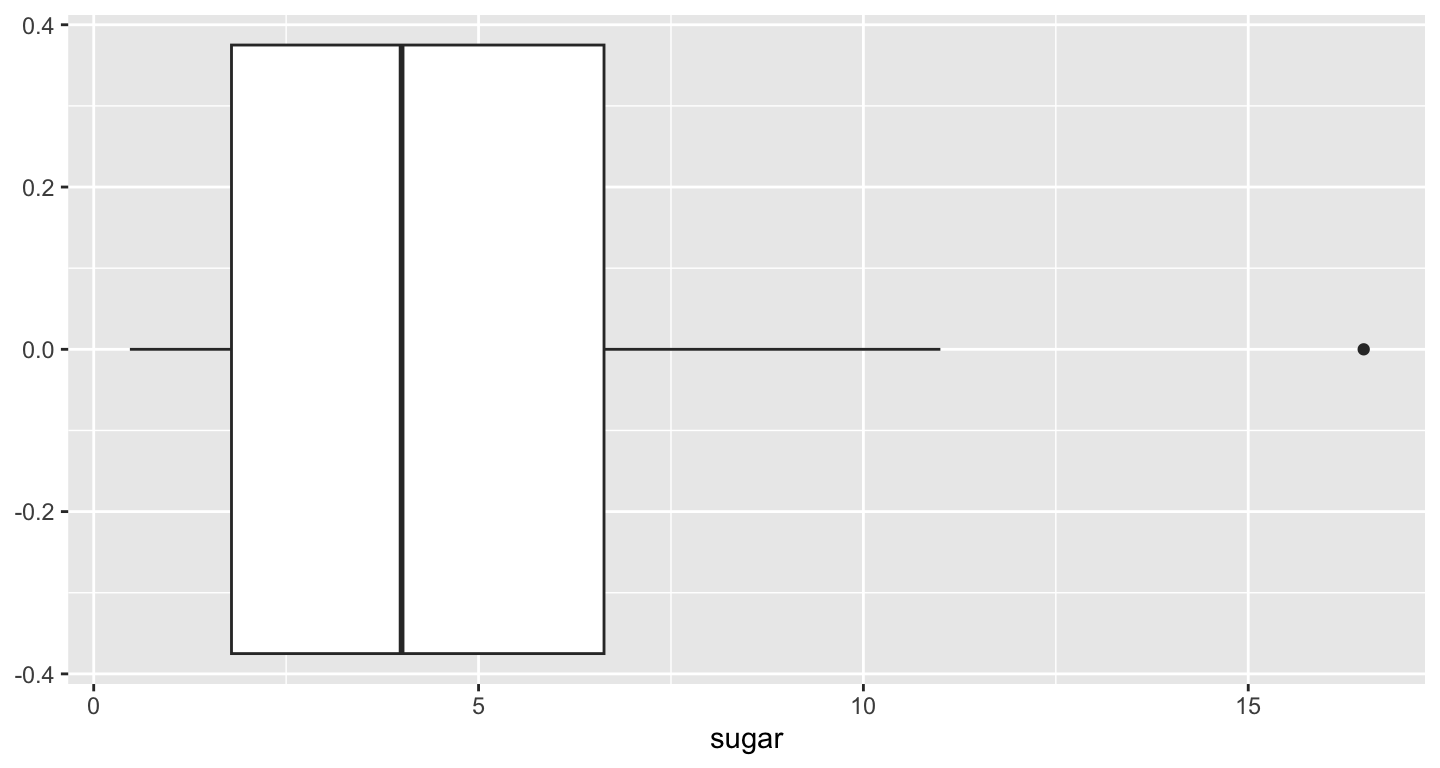 ggplot(data = fruveg, aes(x = sugar)) + geom_boxplot()