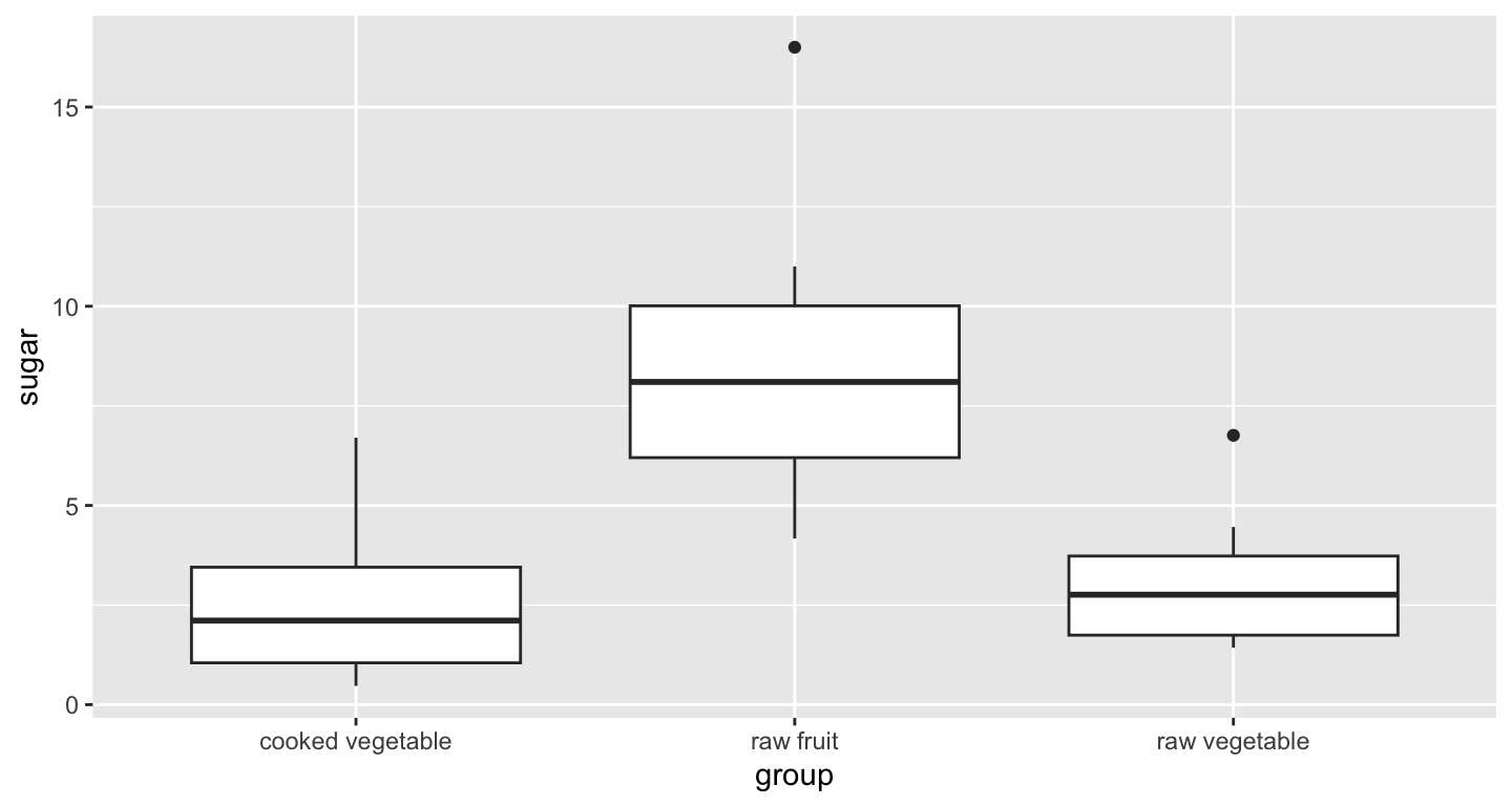 ggplot(data=fruveg, aes(x=group, y=sugar)) + geom_boxplot()