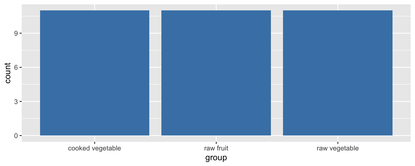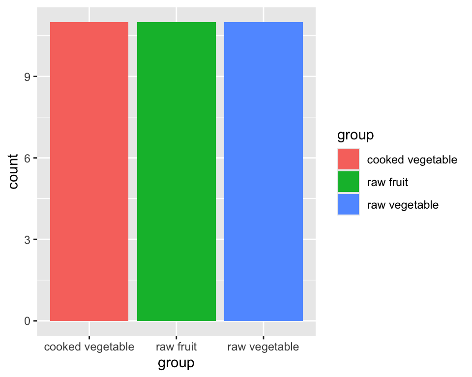 ggplot(data = fruveg, aes(x = group, fill = group)) + geom_bar()