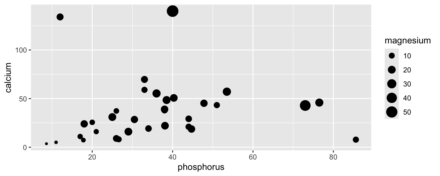 ggplot(fruveg, aes(x = phosphorus, y = calcium, size = magnesium)) + geom_point()