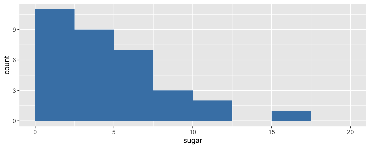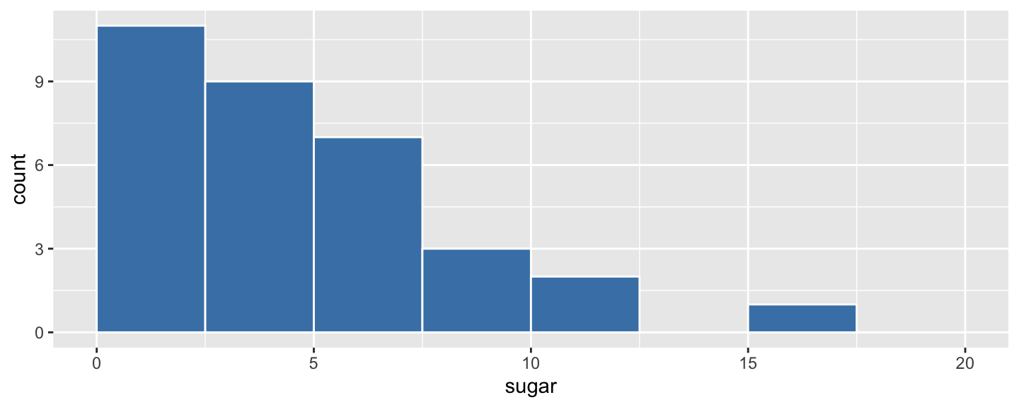 ggplot(fruveg, aes(sugar)) + geom_histogram(breaks = seq(0, 20, 2.5))