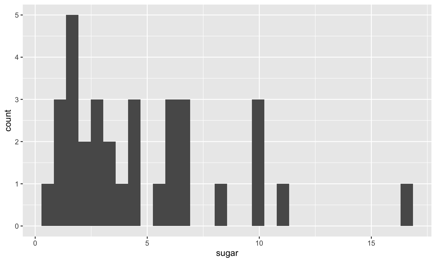 ggplot(fruveg, aes(sugar)) + geom_histogram()