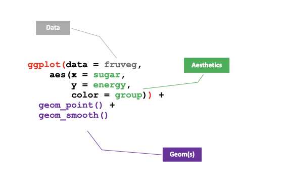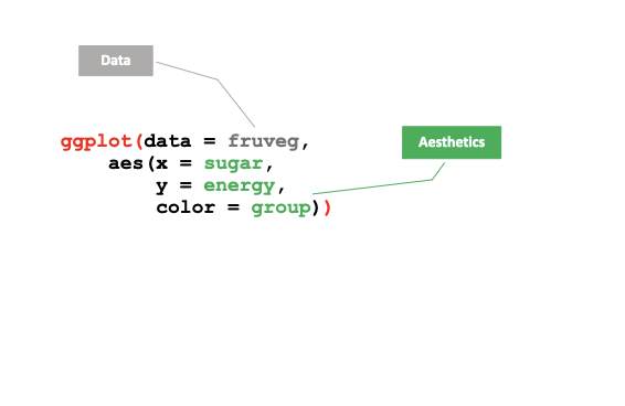 ggplot : création d’un canevas vide dans on va dessiner le(s) graphe(s)aes : déclaration des paramètres esthétiques du graphes (position horizontale, verticale, couleur épaisseur, forme, transparence etc…)geom_bar : utilisation d’une géométrie